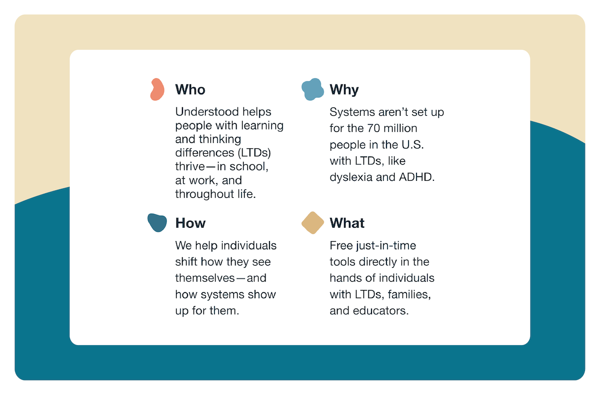 At the intersection of education, mental health, neurodiversity, and equity, funders often struggled to categorize Understood or link their strategic goals to the organization’s work—even when they find the work compelling. Additionally, many funders perceive Understood as a content platform, not a digital-first driver of direct service or systems change.
